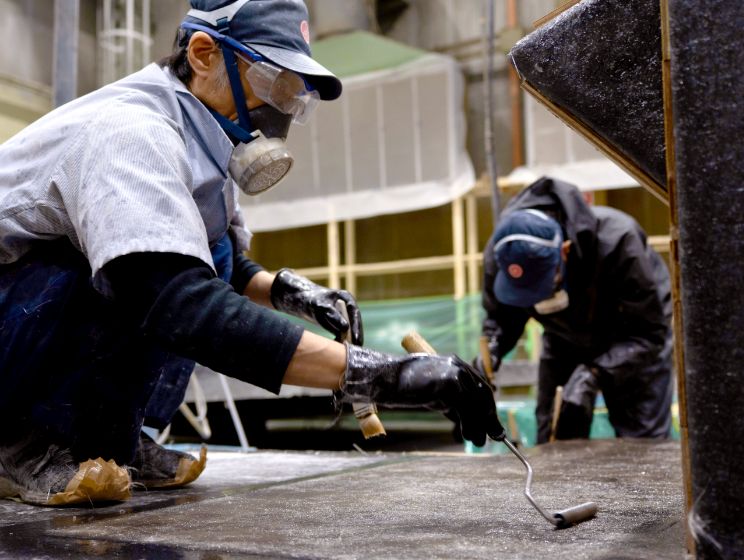 ポリエステル樹脂とガラス繊維を型に張り付けパーツを作り、整形されたパーツのバリ取り、組み立て、磨き上げを行います。