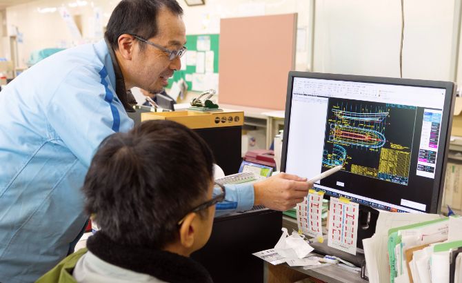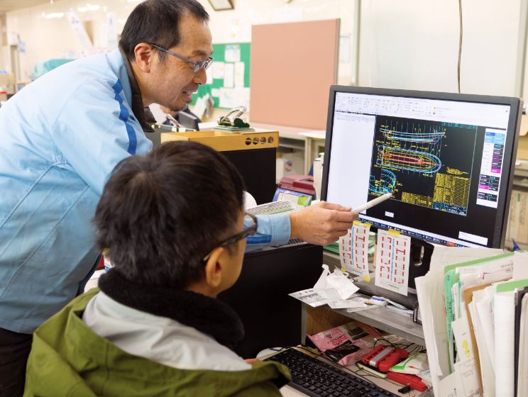 製造過程での漁船・和船の部品検査や、製造後の完成検査を行う仕事です。パソコンを使った品質情報の取りまとめ業務にも携わり、社内の製品品質の均一化や不具合の未然防止に取り組みます。